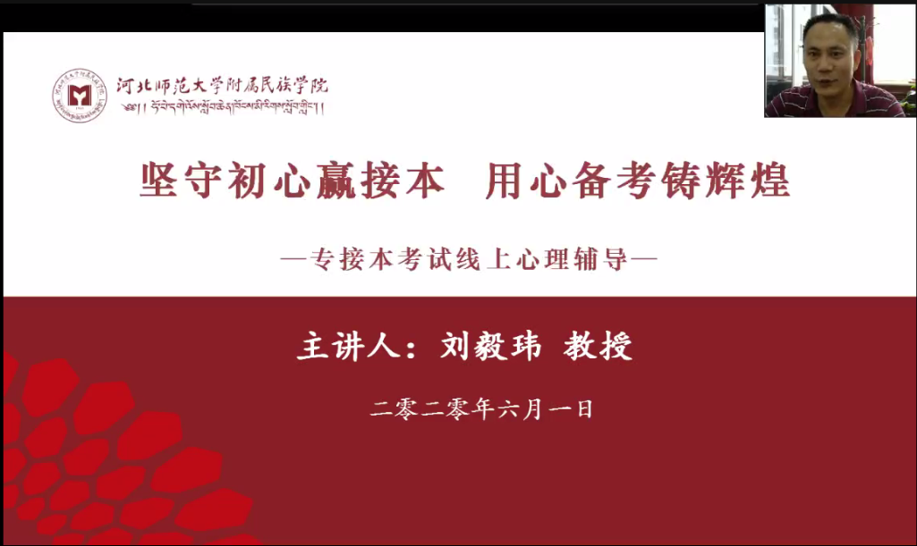 第二场学院专门邀请师大教师教育学院院长刘毅玮教授为参加专接本考试的300余名学生做线上心理辅导讲座。刘教授以“坚守初心赢接本、用心备考铸辉煌”为主题,结合同学们在疫情期间备考出现的学习效率低、自控能力差、心理焦虑、自信心不足等心理困惑,用通俗易懂的语言阐释了心理学的“最小努力原则”和时间管理的“四象限法则”来解决以上问题。她建议备考同学在考试前要明确目标,调整心态和方法,在考试中要关注过程,不关注结果;关注成功,不关注失败;关注自己,不关注别人。以我命由我不由天的信念,去把握自己,把握当下,积极备考,争取优异成绩。
