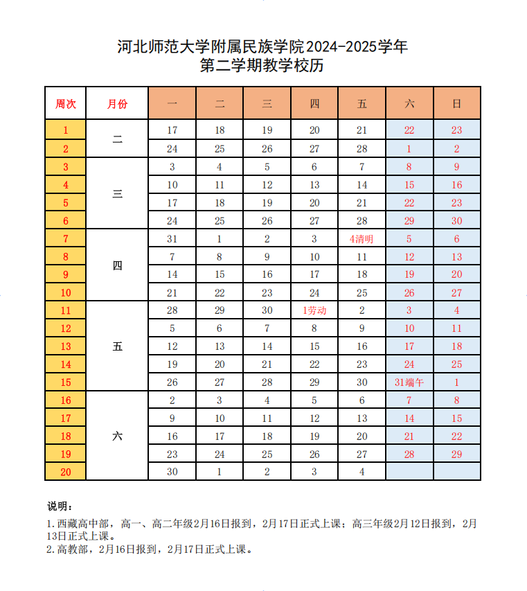 2024-2025学年第二学期校历